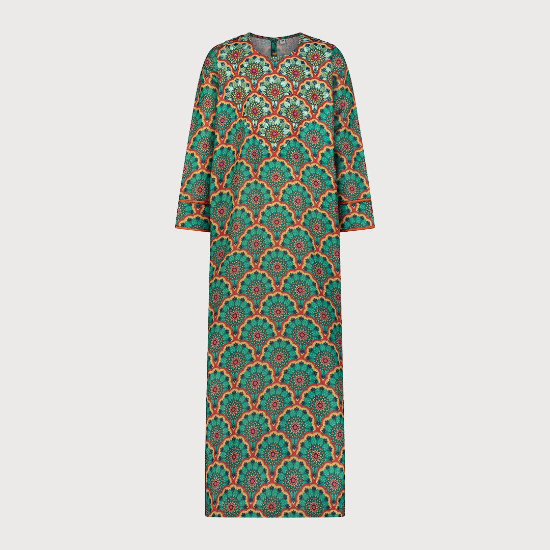 جلابية لينن فاخرة بتطريز يدوي مزركش وألوان غنية مستوحاة من الزخارف الشرقية، تمنحك أناقة راقية ولافتة.